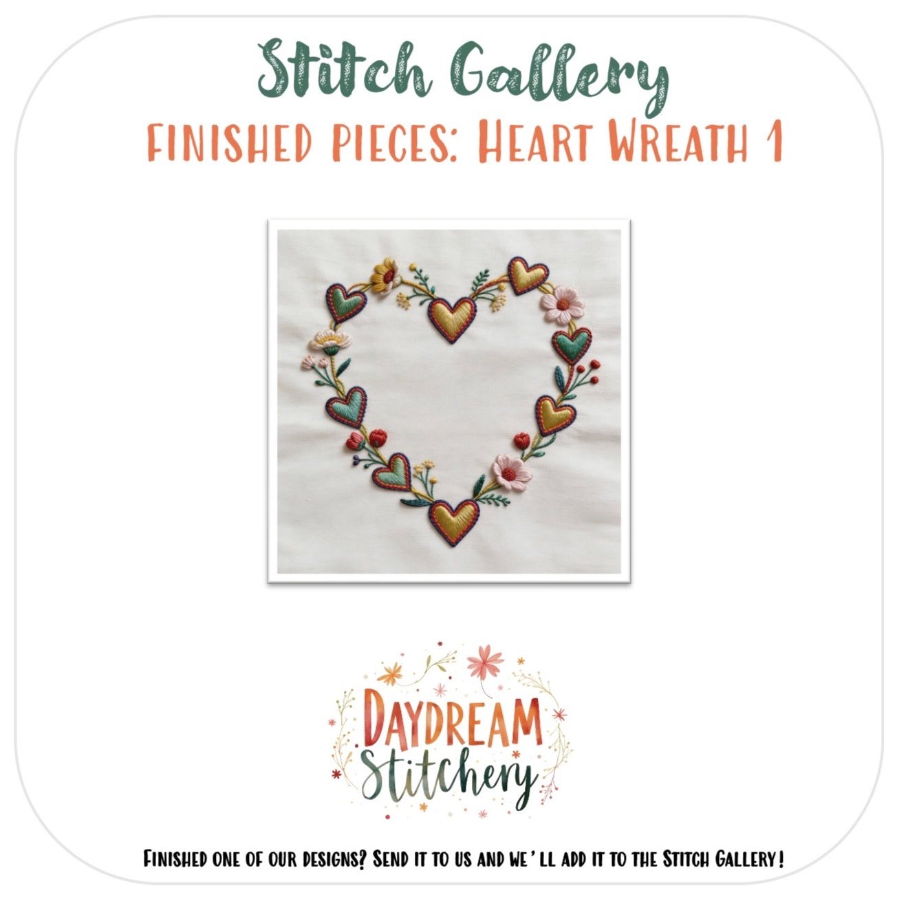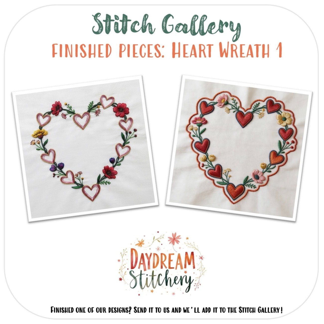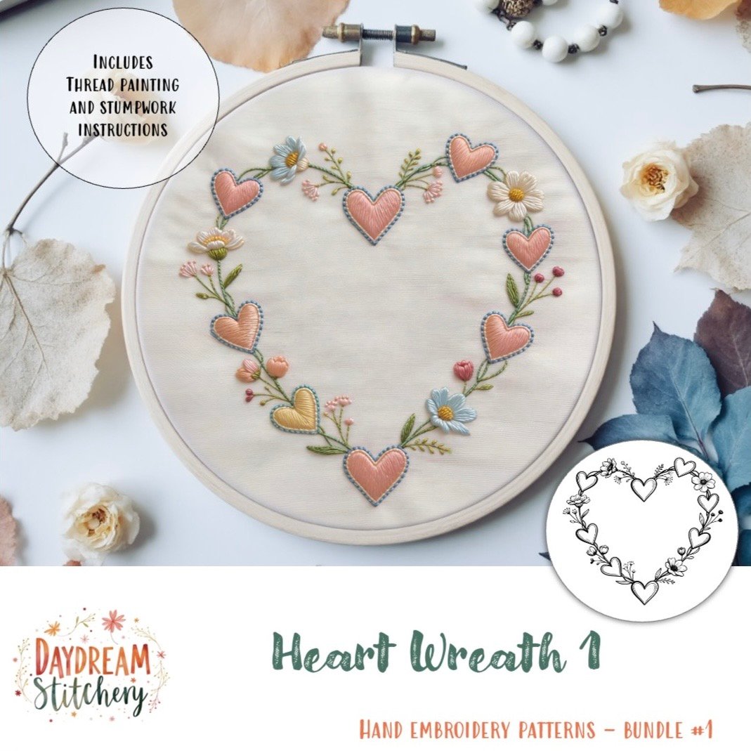 ![Two heart-shaped wreaths with colourful flowers and hearts are embroidered on white fabric using the [Bundle] ‘Heart Wre: Hand embroidery patterns. Text includes “Stitch Gallery: Finished pieces: Heart Wreath 1” and “Daydream Stitchery.”.](https://daydreamstitchery.com/wp-content/uploads/2026/01/heart-wreath-1-hand-embroidery-pattern-3-1160x1160.jpeg)