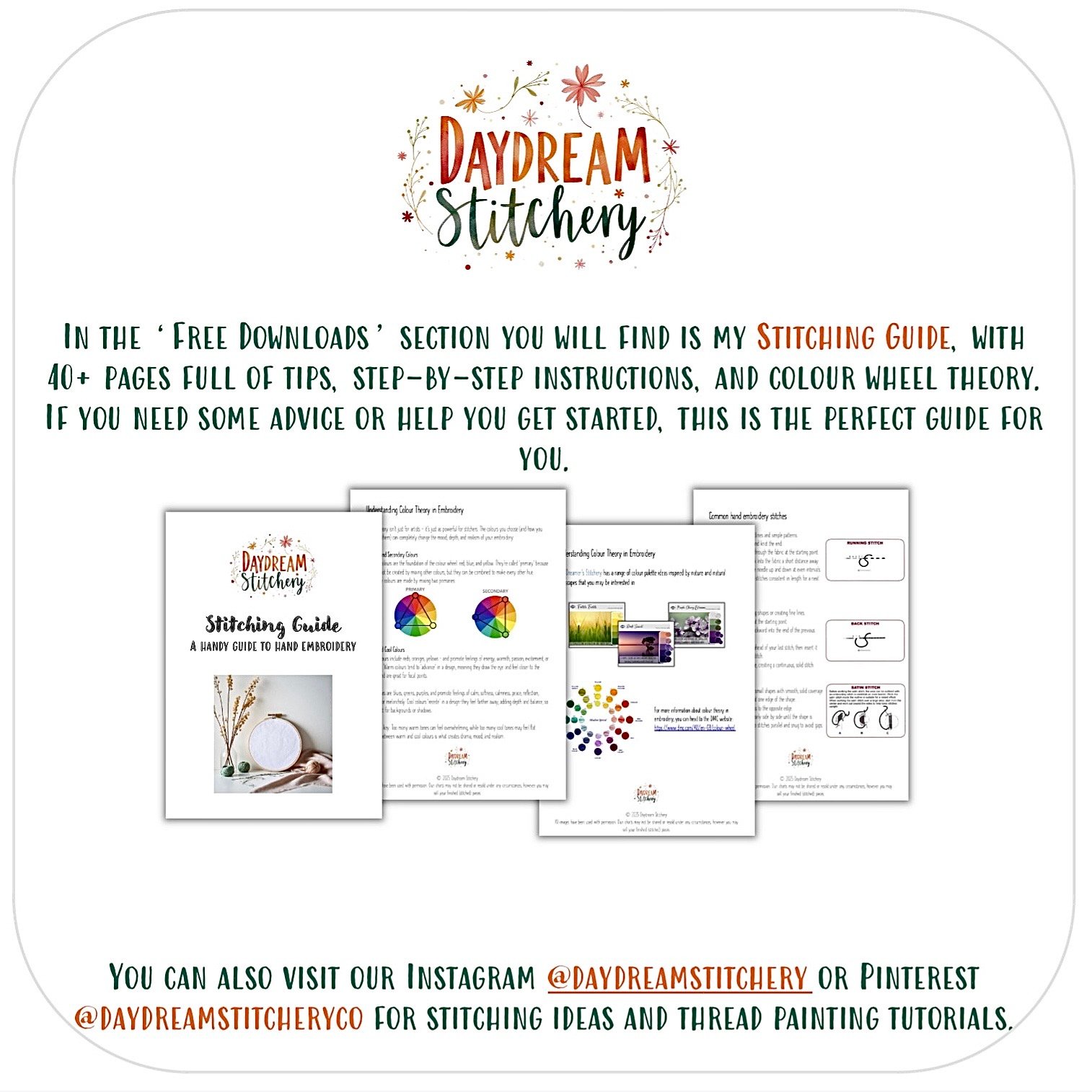 You can follow my Instagram page and Pinterest account for stitch tutorials and inspiration, to help you complete your next project. Our free Stitching Guide is also an excellent resource to explore beginner stitches and advanced techniques.
