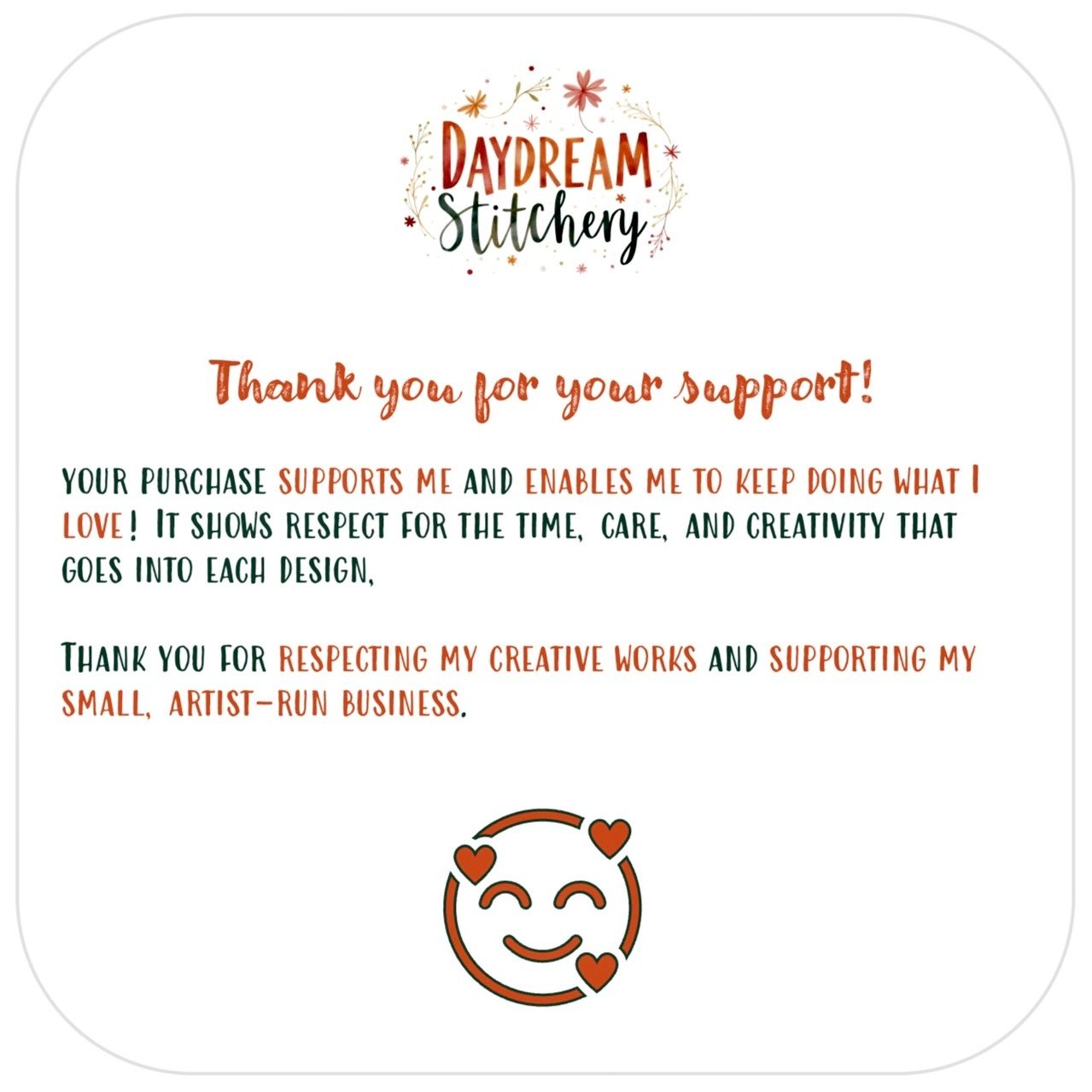 • The design is provided for personal use only and may not be shared, resold, or redistributed in any form. Finished stitched pieces may be sold on a small handmade scale, provided credit is given to Daydream Stitchery. You may resize the design for personal use, but altering the design for resale is not permitted.