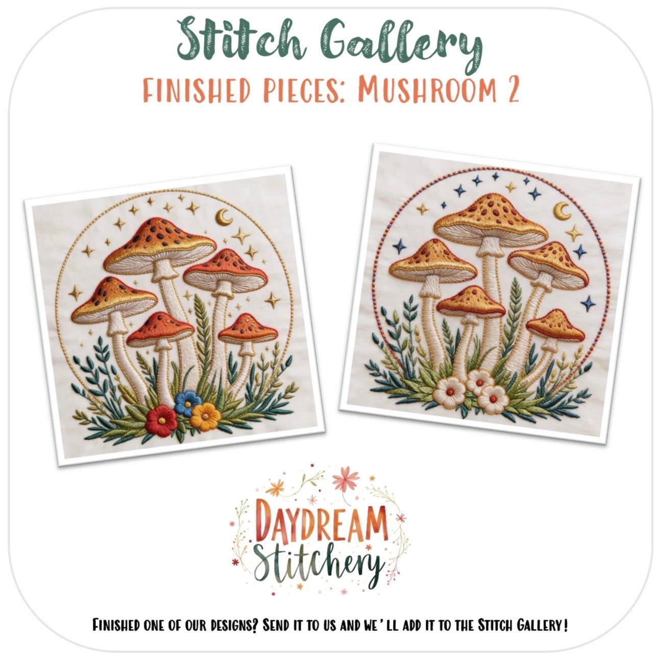 • The design is provided for personal use only and may not be shared, resold, or redistributed in any form. Finished stitched pieces may be sold on a small handmade scale, provided credit is given to Daydream Stitchery. You may resize the design for personal use, but altering the design for resale is not permitted.