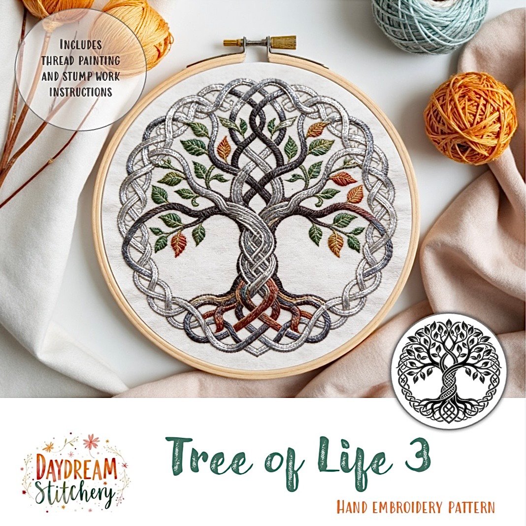 These designs suit a wide range of stitching styles. Keep it simple and meditative with clean lines and earthy tones, or build depth with shading, thread painting, or even padded stitches to give the tree a sense of quiet strength and presence. Whether you’re a confident beginner or an experienced stitcher, the design offers enough structure to feel supported, while still leaving room for personal expression.