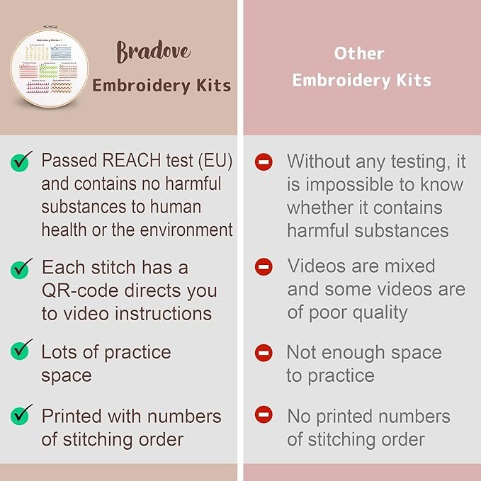 - 【Slow Living: Achieve Inner Peace with Bradove】You are always being told to do more, to go faster, to be better, but it’s time for you to slow down and practice self-care. Your Bradove Embroidery Kit can help you do that. Every time you use Bradove, it allows you to put aside worries, find your own little space of tranquility, and immerse yourself in every stitch and thread. Choose Bradove and make slow living a part of your life, finding peace and joy in every stitch.
