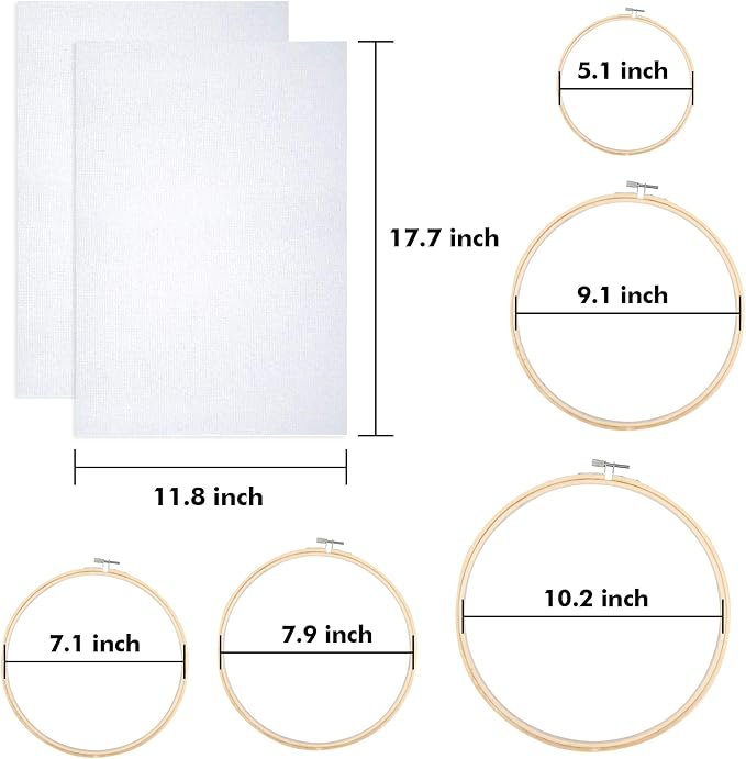 - Common Size: 5 pcs high quality bamboo embroidery hoops, size: 5.1 inch(13cm), 7.1 inch(18cm), 7.9 inch(20cm), 9.1 inch(23cm), 10.2 inch(26cm). 2 embroidery cloth, size: 14 count, 11.8×17.7 inchh.